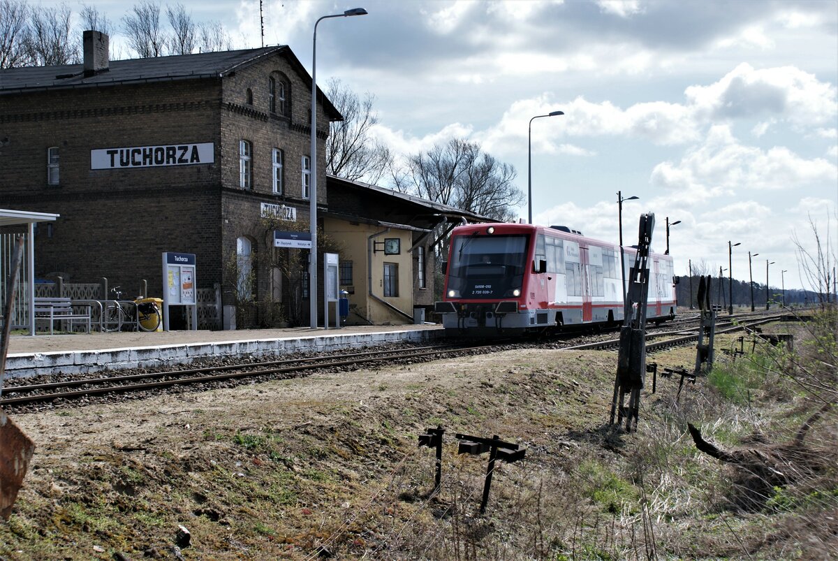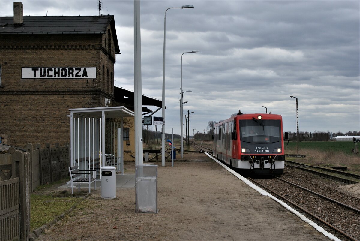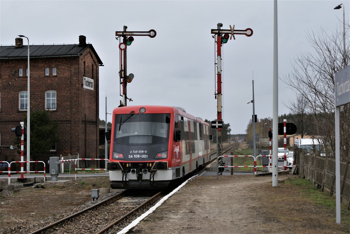 Polen Koleje Wielkopolskie Strecke 328 Leszno-Wolsztyn-Zbąszynek: SA108-001, Zug 77449 Leszno-Zbąszynek, Tuchorza, 7. April 2022. Verkehrten Dampfzüge, versammelten sich einst in Tuchorza Eisenbahnfotografen (und "belebten" gegenseitig ihre Bilder). Inzwischen ist die Station verwaist, ohne Personal und nur mehr eine Haltestelle.