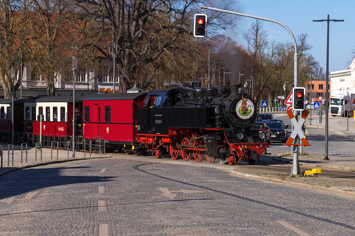 99 2322-8 nach der Ausfahrt aus der Molli-Gasse in Bad Doberan - 17.04.2022