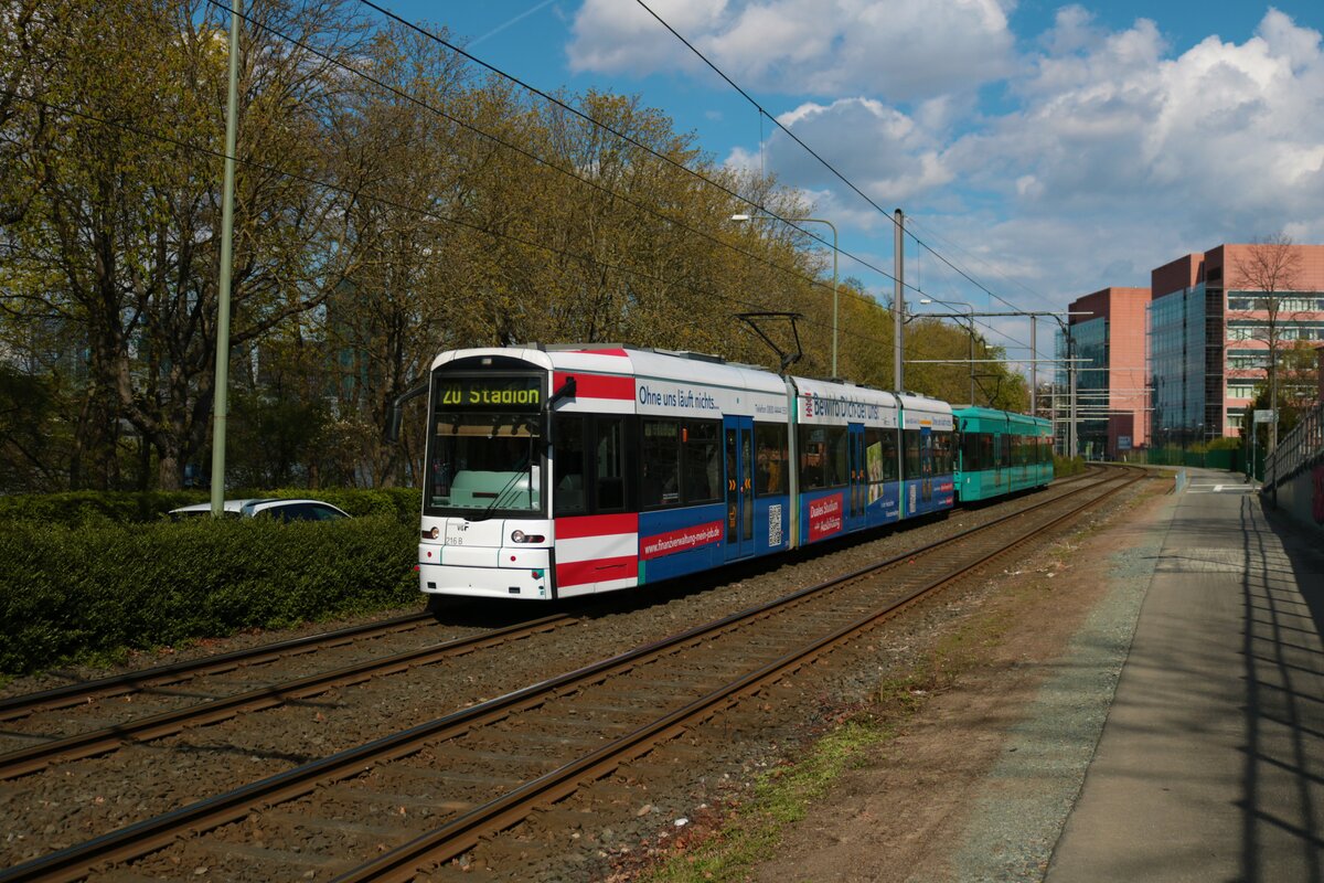 VGF Düwag Pt-Wagen 727+7xxx am 10.04.22 in Frankfurt als Stadionverkehr auf der Linie 20