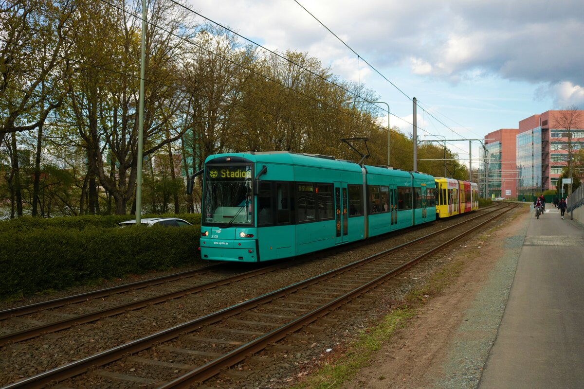 VGF Bombardier Flexity Classic S-Wagen 210+2xx am 10.04.22 in Frankfurt als Stadionverkehr auf der Linie 20