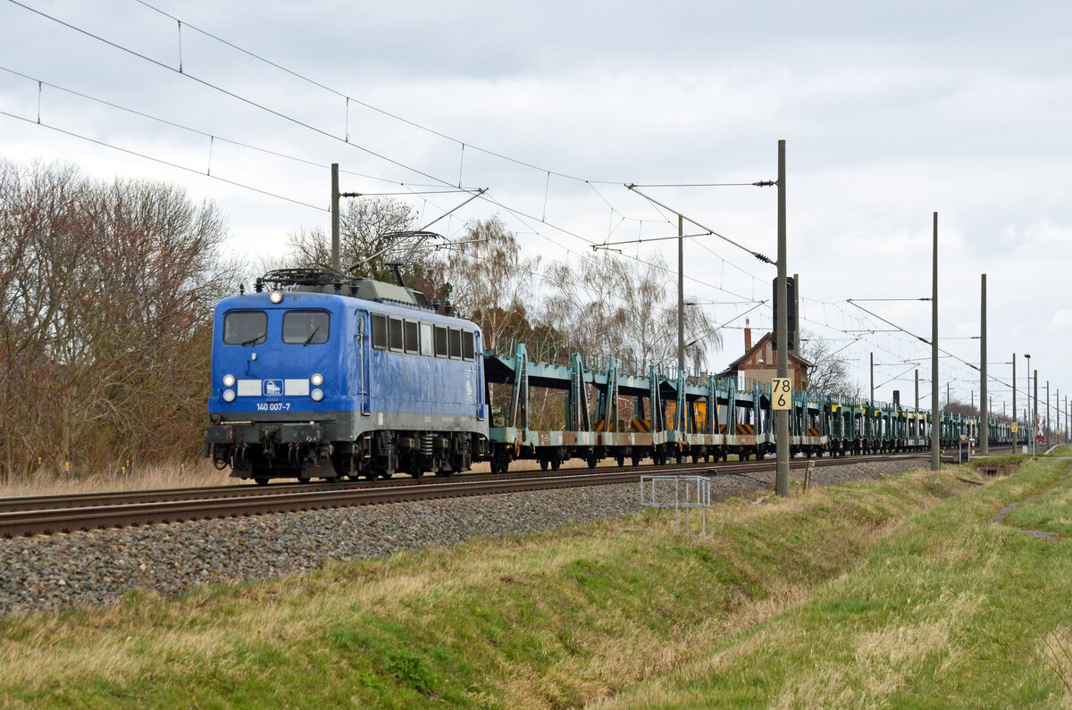 140 007 (140 825) der Press führte am 06.04.22 einen leeren Autozug durch Braschwitz Richtung Halle(S). Ziel des Zuges ist das VW-Werk in Zwickau-Mosel.