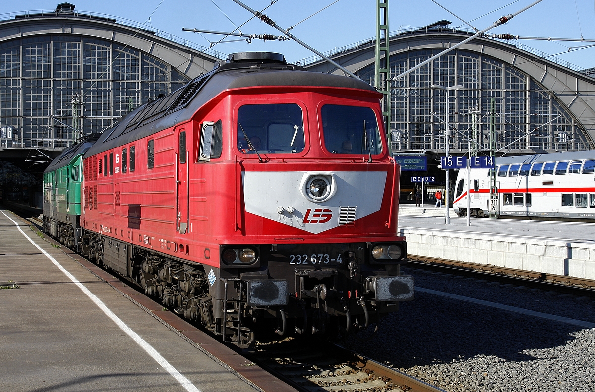 232 673 der DEG und 232 413 von european loco stehen am Morgen des 17.04.2022 abfahrbereit in Leipzig Hbf. Die kyrillische Anschrift (an der Seite der führenden Lok) lässt auf eine Provinienz weit im Osten schließen?).