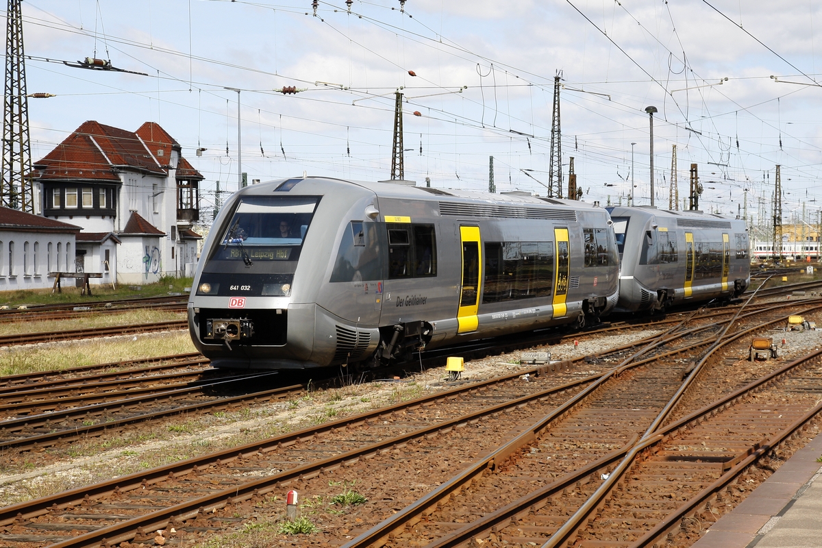 Nachschuss auf 641 001 bei der Ausfahrt in Teuchern in Richtung Zeitz.
