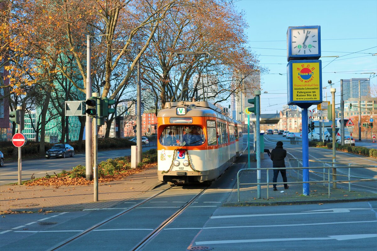 VGF Düwag M-Wagen 102 am 10.12.22 in Frankfurt am Main als Weihnachtsmarkt Tram