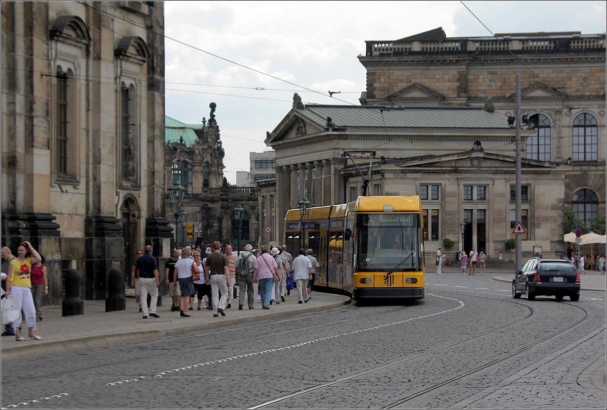 Die Straßenbahn im schönen Dresden - Ein Straßenbahn am Theaterplatz. Links ein Teil der Fassade der Hofkirche, hinter der Straßenbahn die Altstädische Hauptwache, dahinter der Zwinger. 07.08.2009 (M)