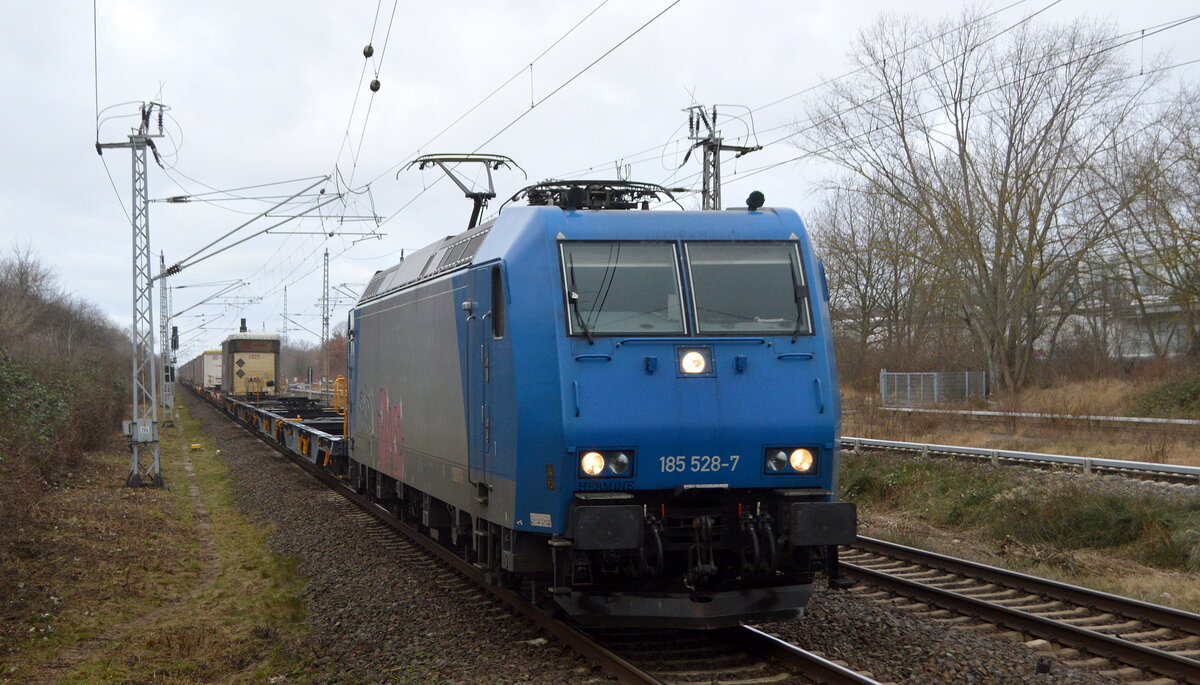 TX Logistik AG, Troisdorf [D] mit  185 528-7  [NVR-Nummer: 91 80 6185 528-7 D-ATLU] und schwach ausgelastetem KLV-Zug ab Rostock-Seehafen am 02.02.22 Durchfahrt Bf. Berlin Hohenschönhausen.