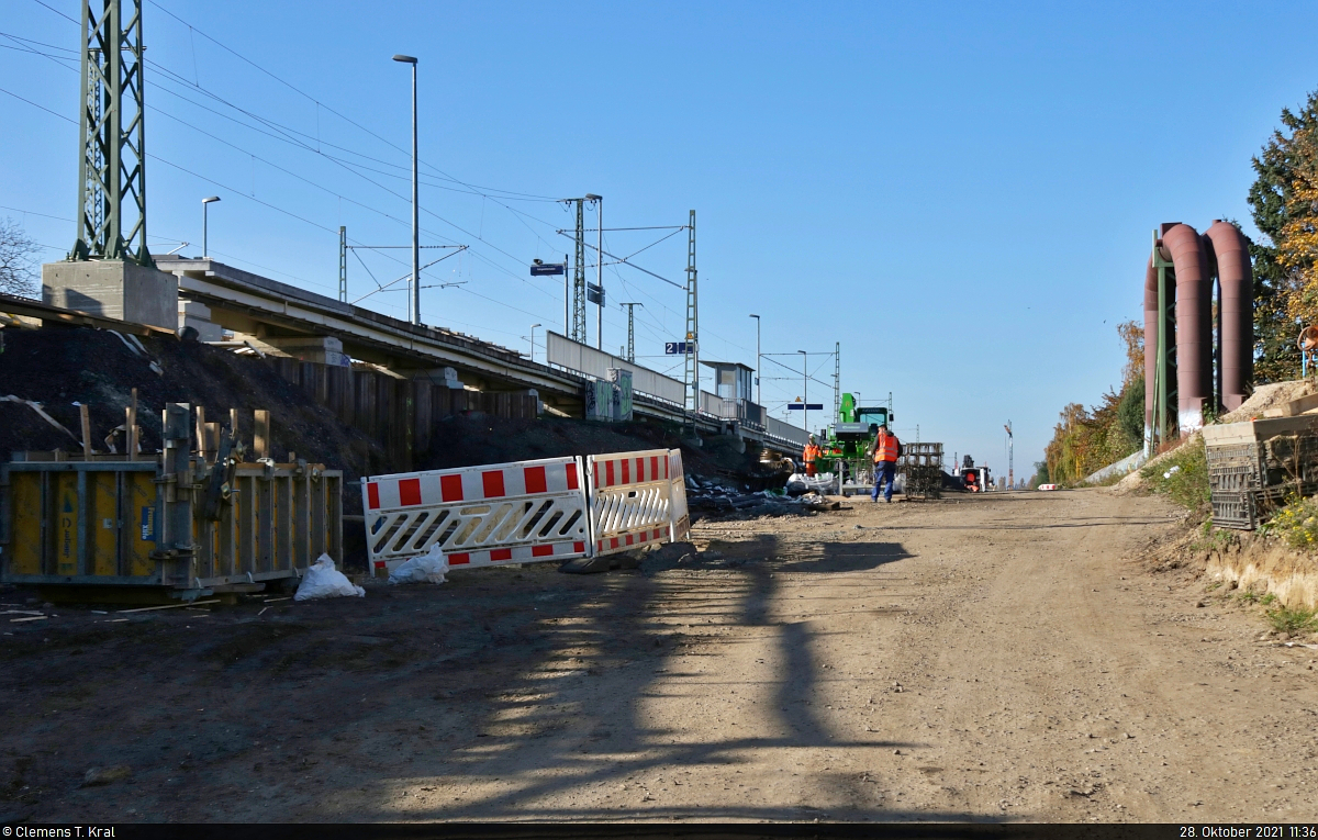 VDE 8 Komplexmaßnahme Halle Rosengarten–Angersdorf ▶ Standort: Halle Südstadt, Eierweg Die Fußgängerbrücke Eierweg über den Ferngleisen wurde ebenfalls komplett neu errichtet. Noch sind hier große Maschinen wie Bagger und ein Kran im Einsatz. Nach einem Jahr Bauzeit wurde sie im Januar 2022 freigegeben. 🚩 Bahnstrecke Halle–Hann. Münden (KBS 590) 🕓 28.10.2021 | 10:30 Uhr (Smartphone-Aufnahme hinter dem Bauzaun)