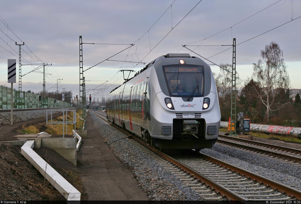 Am ersten Betriebstag der kompletten S3 hatte u.a. 1442 214 (Bombardier Talent 2) noch mit Verspätungen zu kämpfen. Erster Halt nach dem Kopfmachen in Halle(Saale)Hbf ist nun Halle Rosengarten.