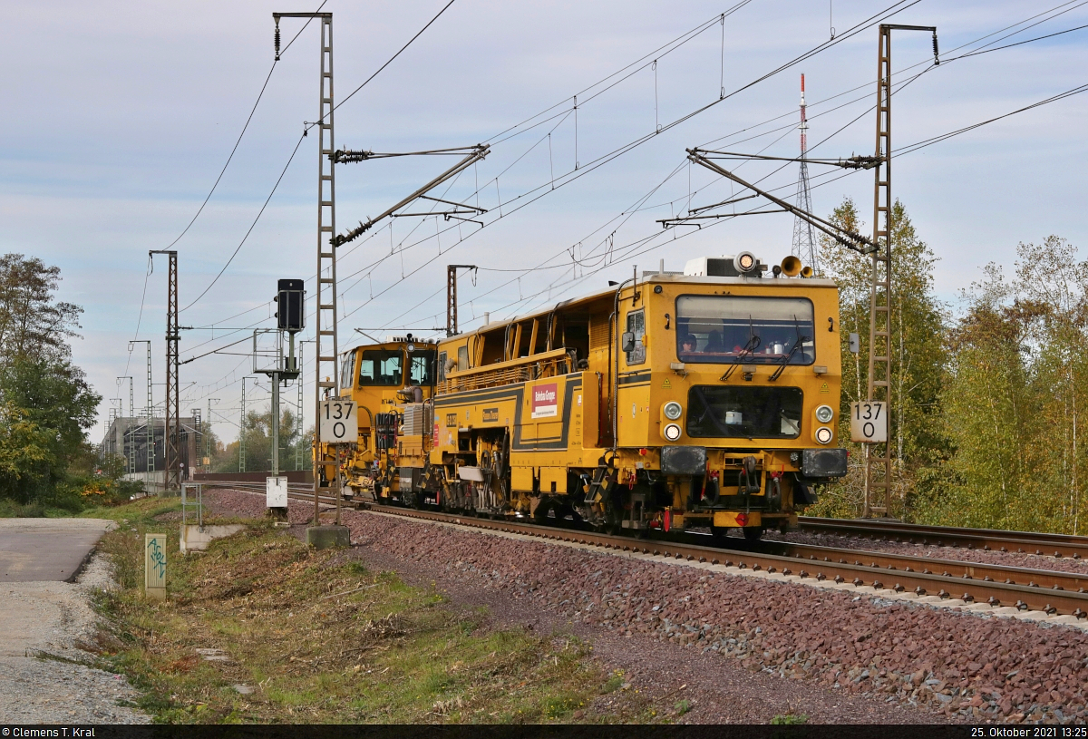 Nachschuss auf eine Schotterplanier- und Profilierungsmaschine Plasser & Theurer SSP 110 SW (99 80 9425 024-3 D-ERD), die mit Universalstopfmaschine Plasser & Theurer Unimat 09-4x4/4S (99 80 9121 010-9 D-ERD) den Hp Magdeburg Herrenkrug Richtung Biederitz durchfährt.