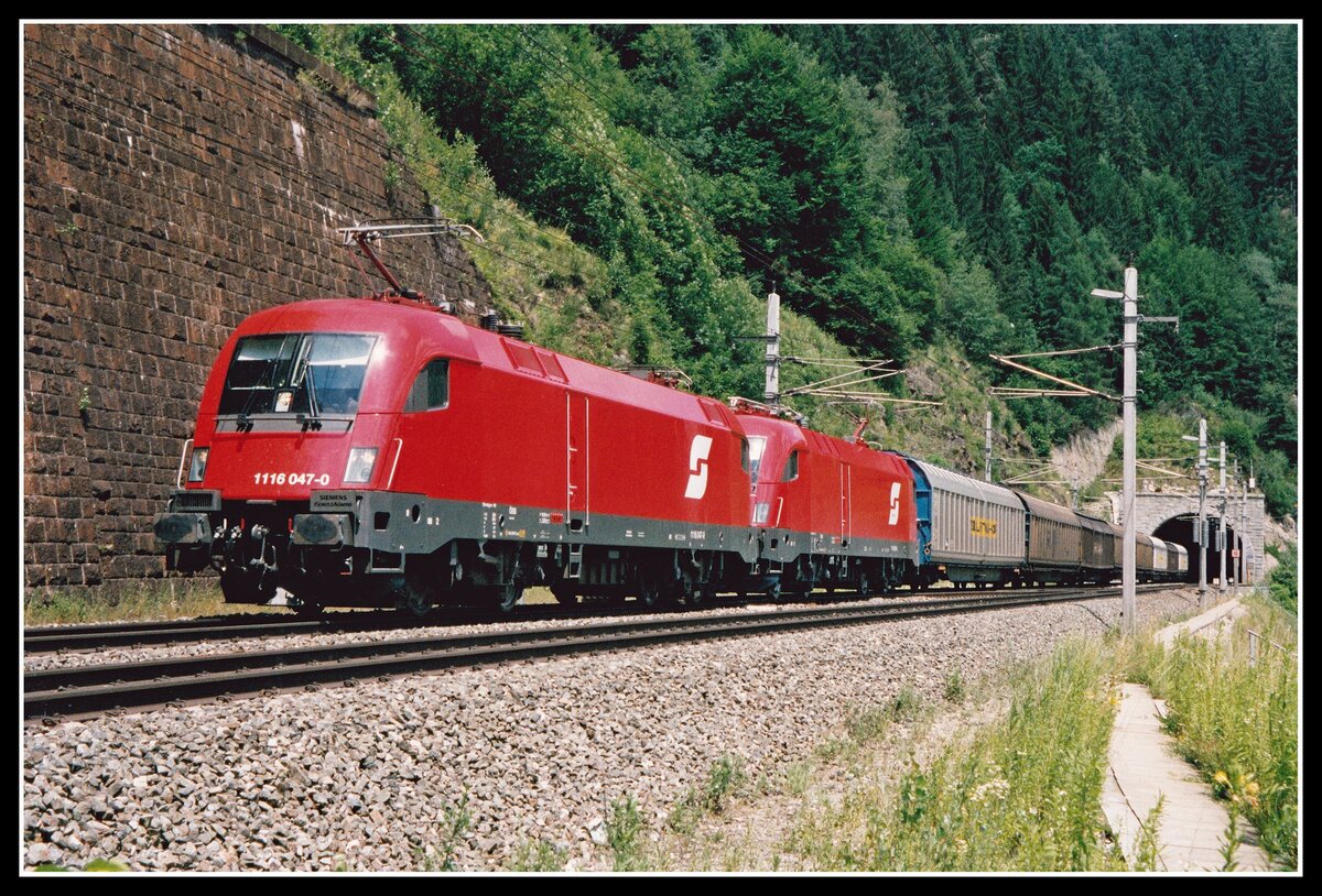 1116 047 + 1116 064 fahren am 30.06.2002 mit einem Güterzug zwischen Galgenbergtunnel und Annabergtunnel durchs Murtal.
