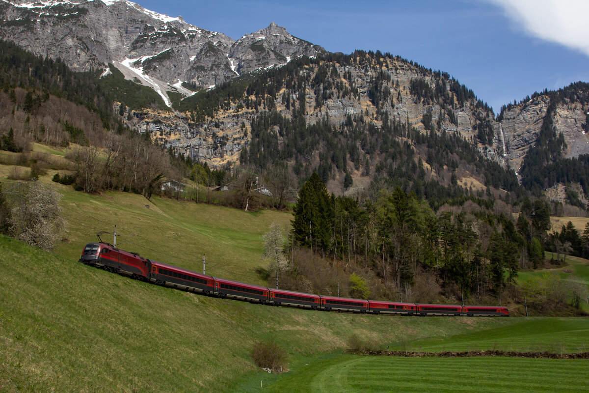 1116 222 schiebt den Railjet gen St. Anton im Brazer Bogen. 13.4.22