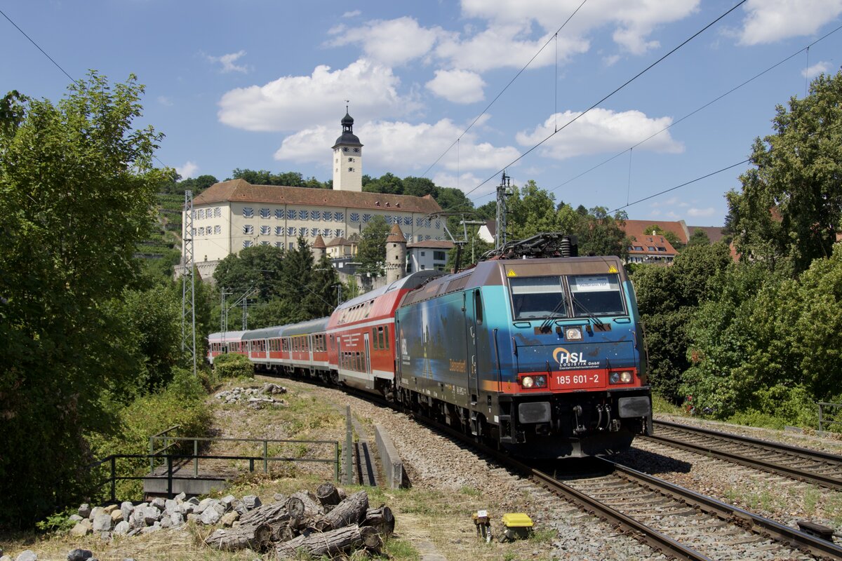 185 601 der Beacon Rail Leasing Ltd, vermietet an die HSL Logistik GmbH, war am 05. Juli 2022 im Auftrag der Wedler Franz Logistik GmbH & Co. KG für die SWEG-Bahnen-Stuttgart mit dem RegionalExpress 99155 (RE10a) von Heidelberg Hauptbahnhof über das Neckartal nach Heilbronn Hauptbahnhof unterwegs, hier im Bahnhof Gundelsheim unterhalb des Schloss Horneck.