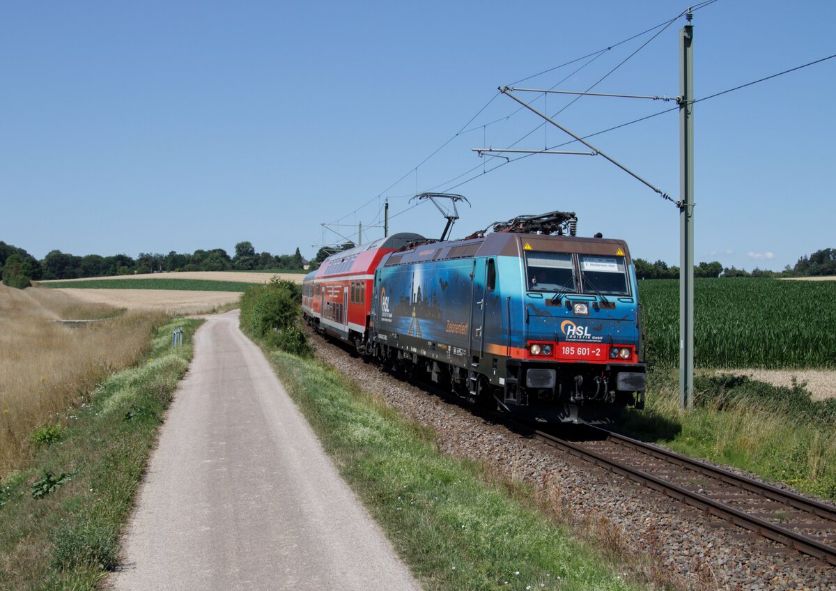185 601 der Beacon Rail Leasing Ltd, vermietet an die HSL Logistik GmbH, war am 05. Juli 2022 im Auftrag der Wedler Franz Logistik GmbH & Co. KG für die SWEG-Bahnen-Stuttgart mit dem RegionalExpress 99153 (RE10b) von Heidelberg Hauptbahnhof über Sinsheim im Elsenz Hauptbahnhof nach Heilbronn Hauptbahnhof unterwegs, hier zwischen den Bahnhöfen Bad-Rappenau und Bad-Wimpfen bei Bad-Wimpfen - Hohenstadt.