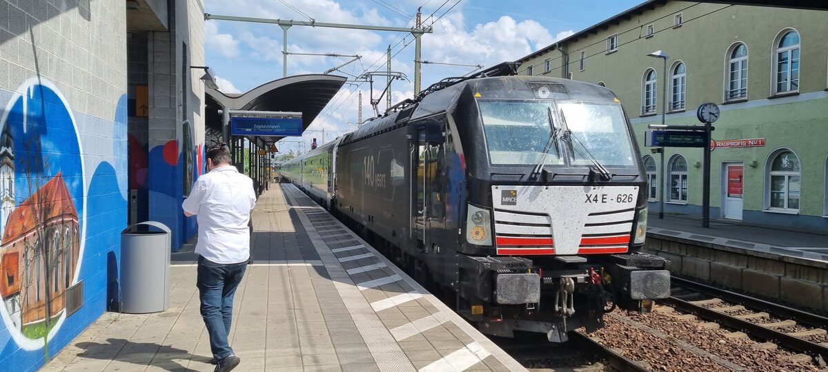 ALEX 223 068 treft am 27 Mai 2022 in Schwandorf ein, wo deren Zug geteilt wird: die 1. drei Wagen verfolgen den Weg mit 223 068 nach Plzen über Furth-im-Wald, die letzte drei gehen weiter nach Hof.