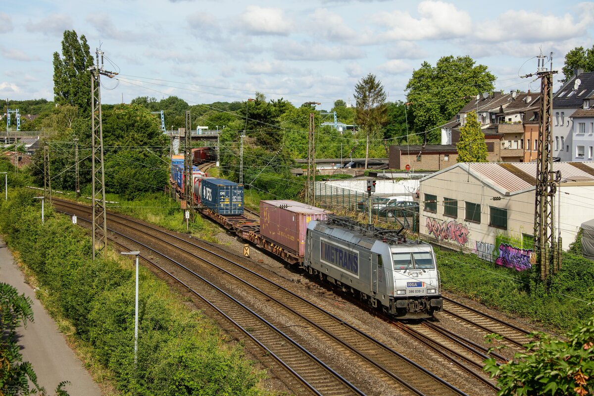 386 039-2 METRANS mit Containerzug in Oberhausen Osterfeld, Juli 2022.