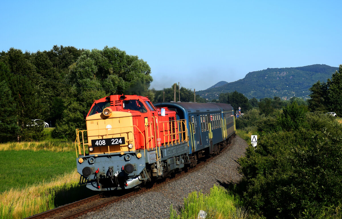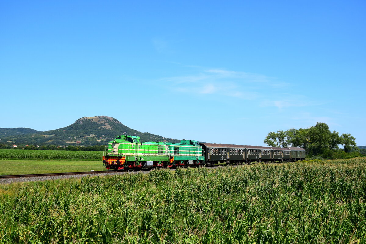Die vulkanische Zeugenberge in der Nähe des Plattensees sind immer Fotomotiv für die Eisenbahn-Fans. Die M40 219 + M40 114 mit dem Planzug 19784 kurz vor Tapolca. Der Berg im Hintergrund: der Csobánc (376 m).