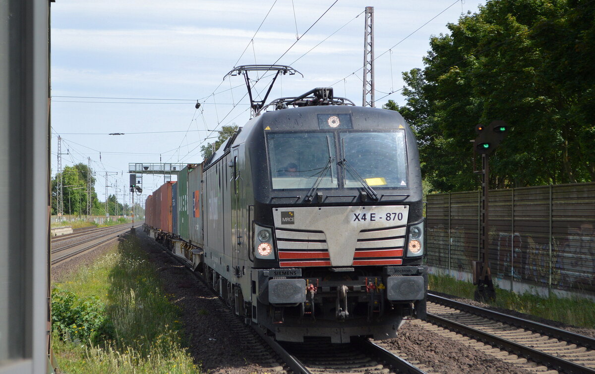 boxXpress.de GmbH, Hamburg [D] mit der MRCE Vectron "X4 E - 870" [NVR-Nummer: 91 80 6193 870-3 D-DISPO] und Containerzug am 18.07.22 Vorbeifahrt Bahnhof Dedensen Gümmer.