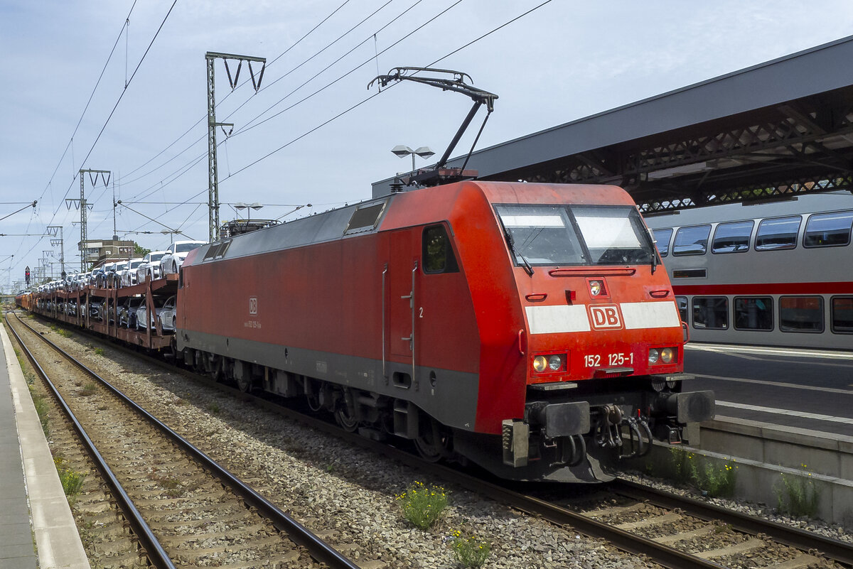DB Baureihe 152 125 am 18.7.2022 Durchfahrt mit einem Autotransport durch den Bahnhof Leer; südwärts.