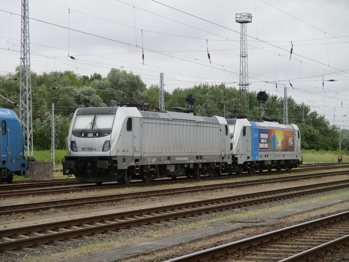 Die Akiem 187 500 und dahinter Railpool 187 343,am 17.Juli 2022,im Rostocker Seehafen.