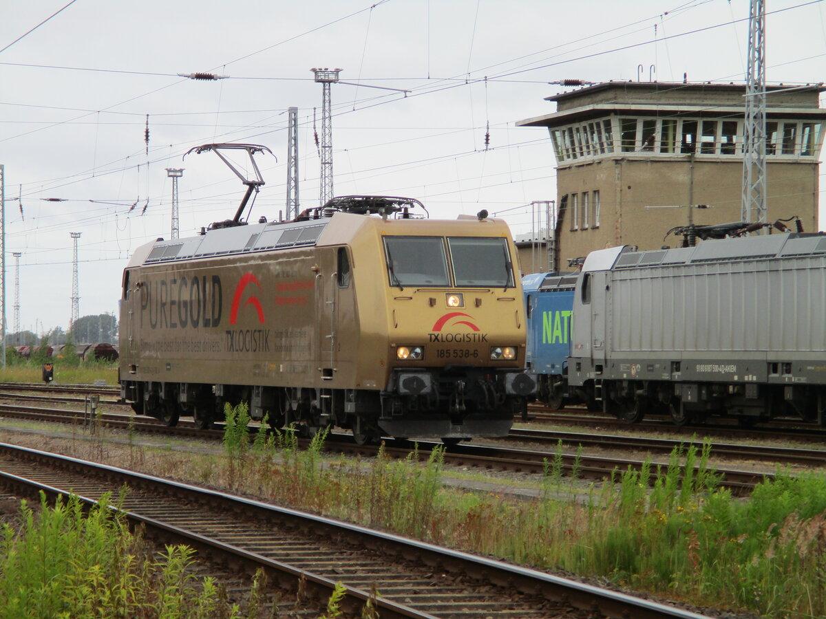 Die goldfarbende 185 538,von TX Logistik,unterwegs,am 17.Juli 2022,in Rostock Seehafen.