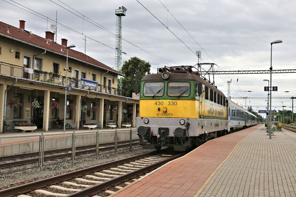 Elektrolok 430330 der Raaber Bahn steht hier am 12.7.2022 um 09.12 Uhr mit einem Interregio abfahrbereit am Bahnsteig im Bahnhof Szentgotthard.
