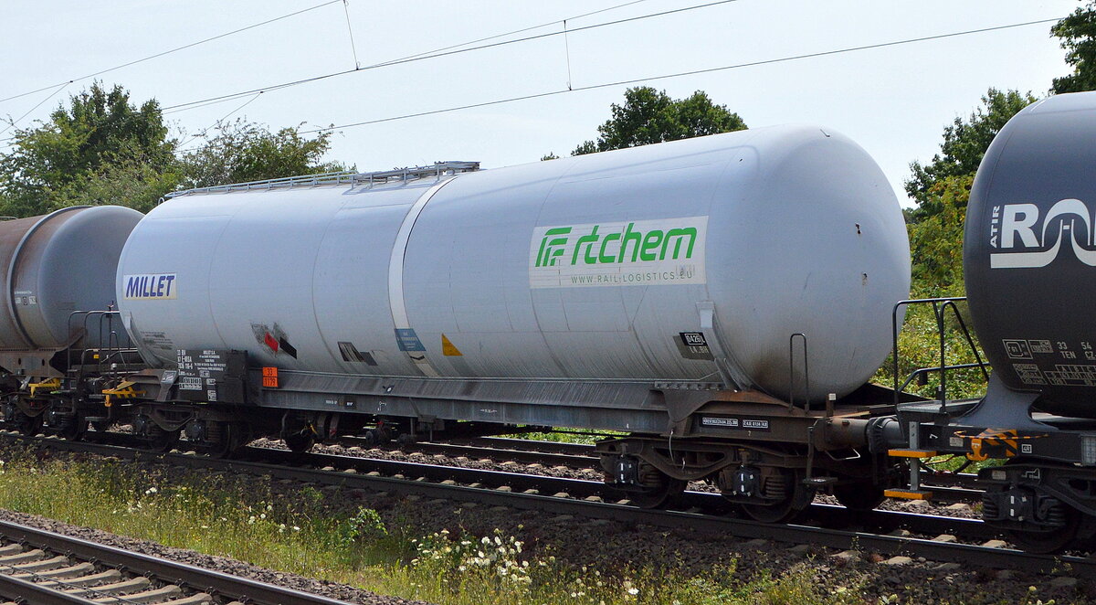 Französischer Kesselwagen vom Einsteller MILLET SA. mit der Nr. 33 RIV 87 F-MISA 7836 116-6 Zans Firmenlogo: rtchem/www.RAIL-LOGISTICS.EU für das Ladegut lt. UN-Nr.: 33/1179 = Ethylbutylether (klopfhemmender Zusatz in Kraftstoffen für Ottomotoren) in einem Ganzzug am 18.07.22 Vorbeifahrt Bahnhof Dedensen Gümmer.