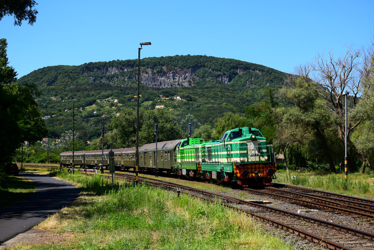 Immer wieder Bergen und Ganz-Jendrassik Dieselloks am Plattensee. Die M40 219 und 114 mit dem Planzug 19775 verlässt dem Bahnhof Badacsonytomaj. Die Orgeln des Berges Badacsony erheben sich über dem Zug.