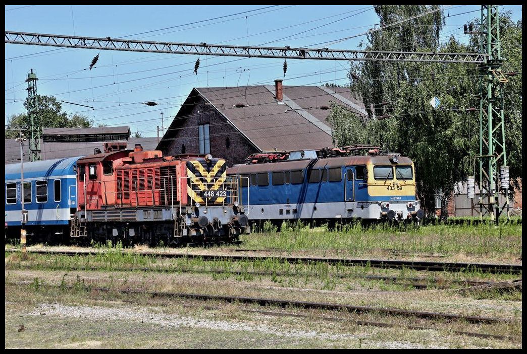 In Höhe des BW im Bahnhof Nagykanizsa rangiert am 13.7.2022 um 13.55 Uhr die MAV 448 423 einige Personenwagen. Im Hintergrund abgestellt ist die MAV Elektrolok 433 159 zu sehen.