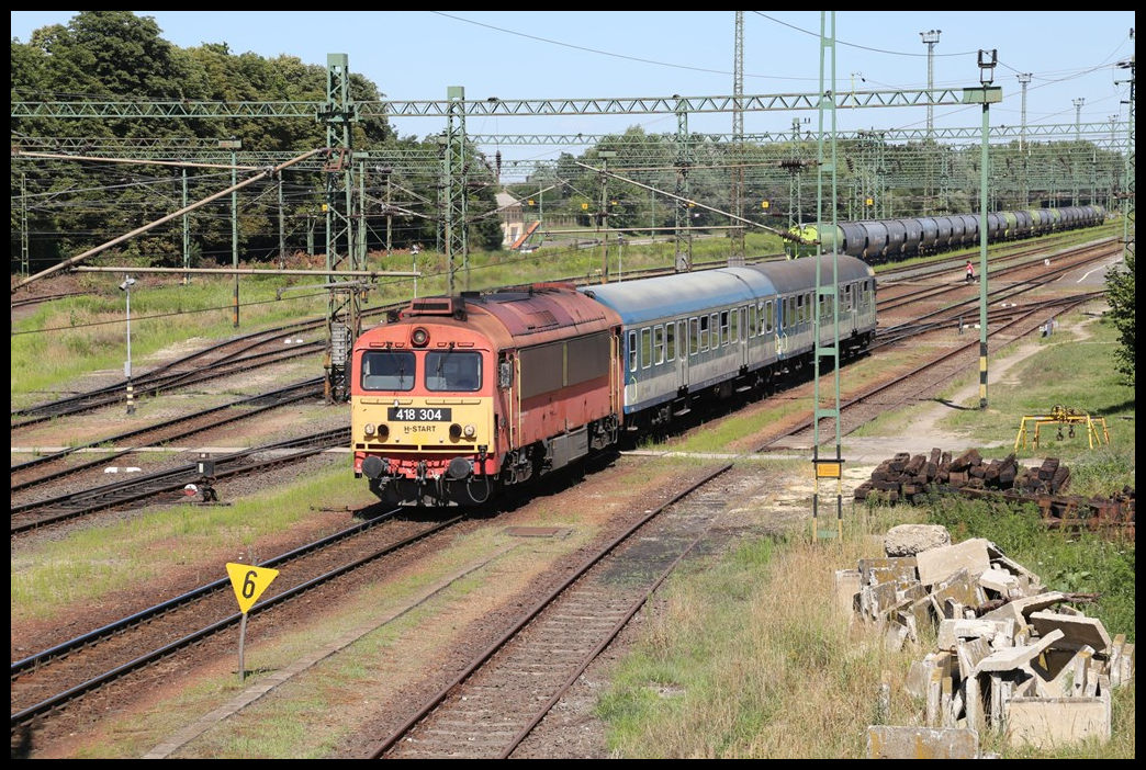 MAV Diesellok 418304 verläßt am 13.7.2022 um 15.09 Uhr den Bahnhof Murakereztür mit einem Interregio nach Pecs.