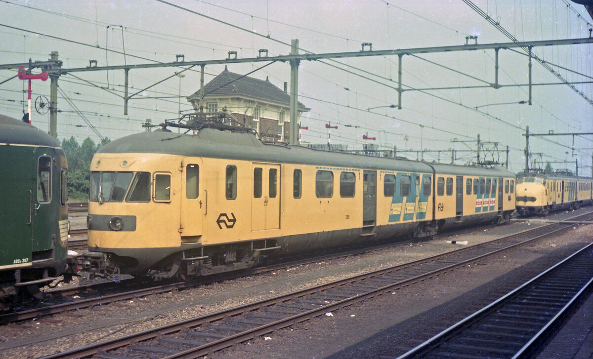 Nur wenige Züge der Reihe Mat46 wurden in gelb umlackiert. Hier NS 299 in Roosendaal am 30.08.1975, ca 12.45u. Die meisten Züge blieben grün, wie der links zu sehende NS 297.