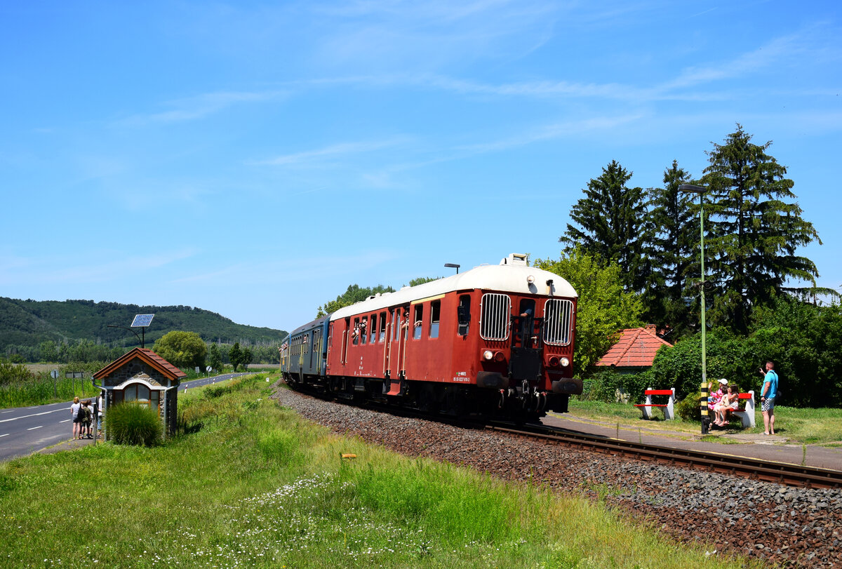 Retro Wochenende in Ungarn: die ABbmot 610 (Altbau Ganz Triebwagen aus dem Jahr 1956.) mit dem Planzug 19785 bei der Durchfahrt in Hst. Badacsonylábdihegy.