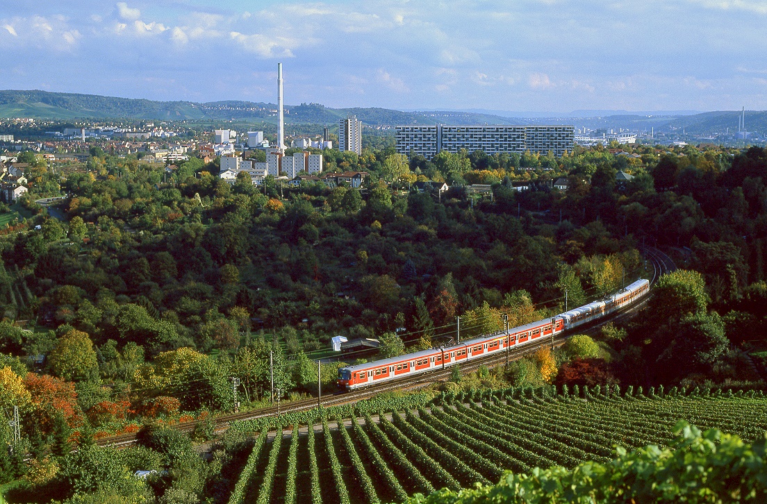 Im Sommer 1991 kommt 5047 035-0 mit einem Regionalzug aus Aigen-Schlägl in Linz-Urfahr an, rechts der Talbahnhof der Pöstlingsbergbahn
