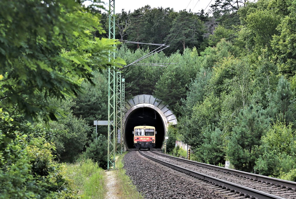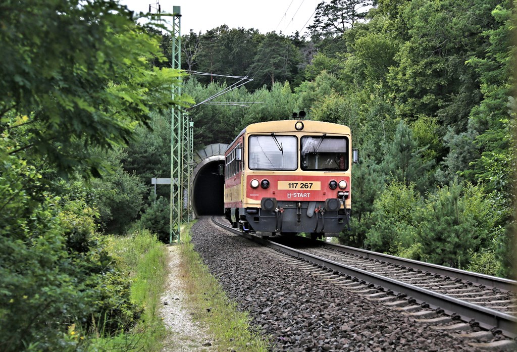 Triebwagen 117267 verläßt bei Nagyrakos, aus dem slowenischen Grenzbahnhof Hodos kommend, am 12.7.2022 um 11.08 Uhr den einzigen Tunnel der Strecke.