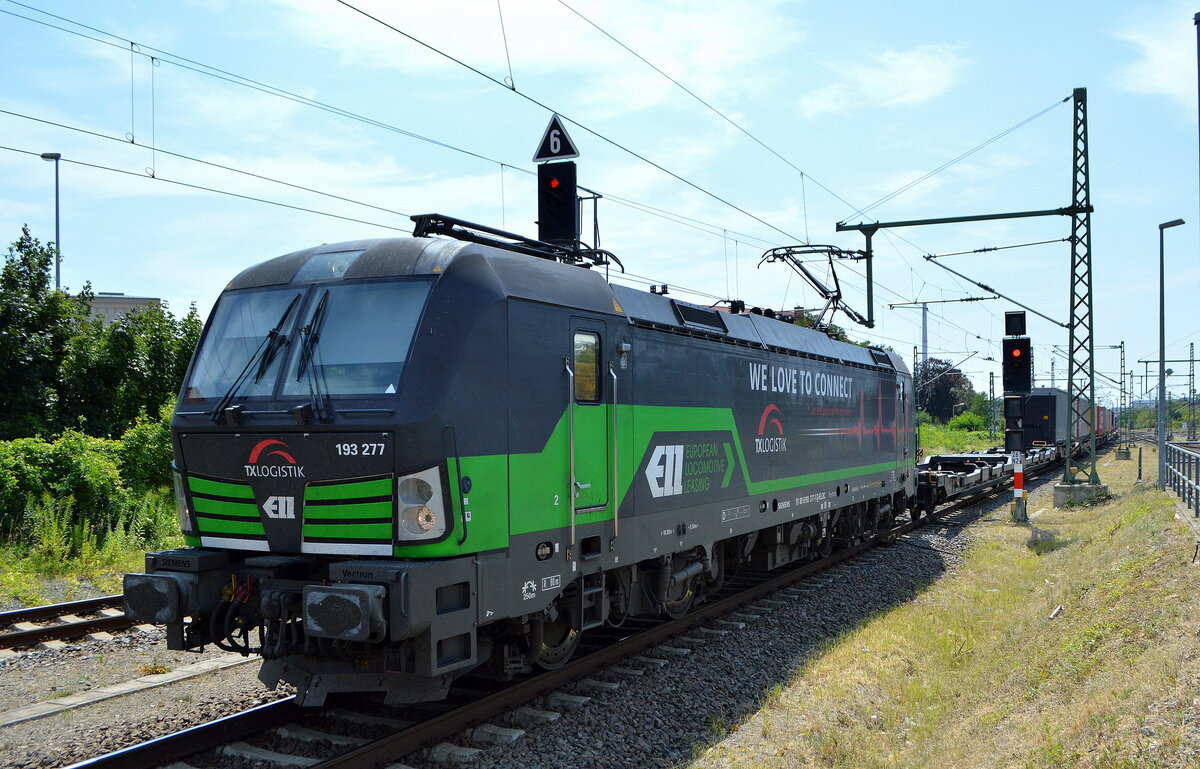 TX Logistik AG, Troisdorf [D] mit der ELL Vectron "193 277" [NVR-Nummer: 91 80 6193 277-1 D-ELOC] und KLV-Zug am 20.07.22 Durchfahrt Bahnhof Dessau Hbf.