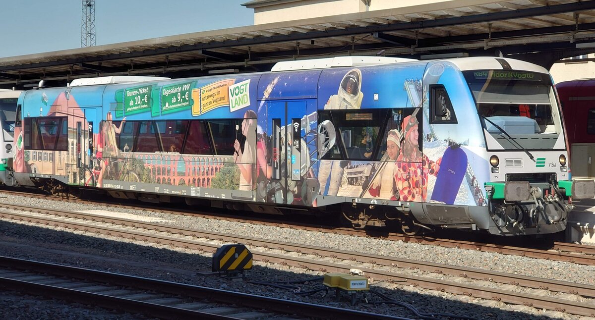 VT 564 der Vogtlandbahn (650 564-7 D-DLB) mit seiner auffälligen Lackierung am 20.7.22 in Gera Hbf vor der Fahrt nach Adorf (Vogtland).