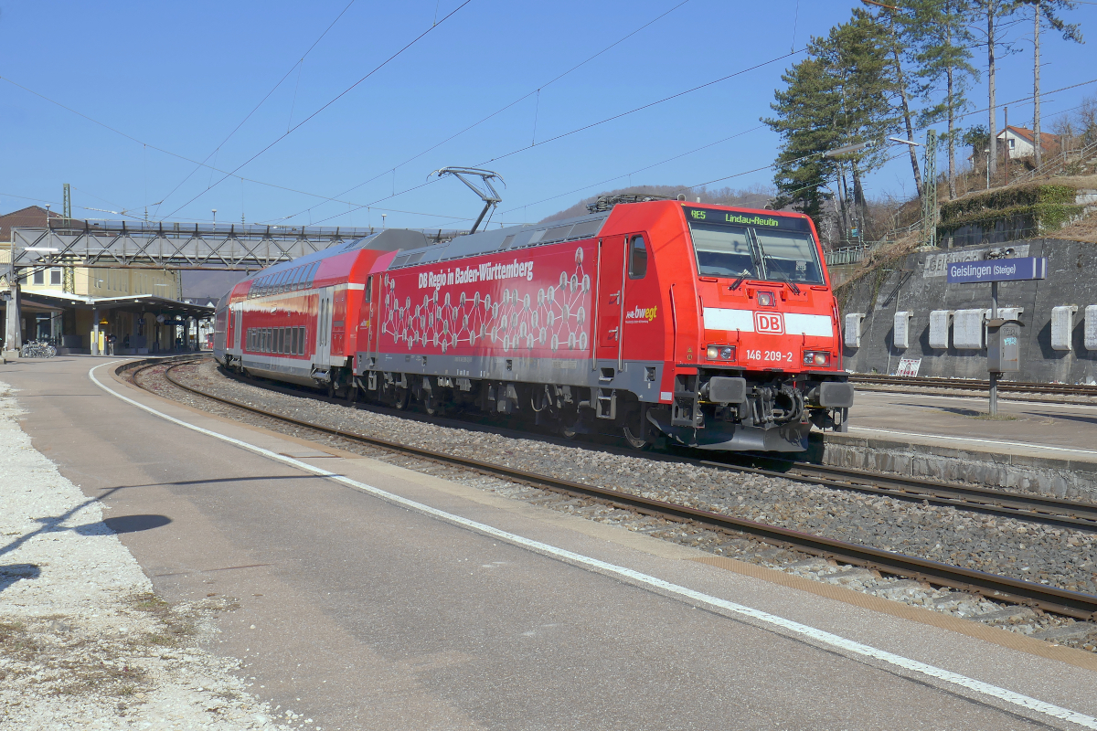 Die gepflegte 146 209 mit ihrer großflächigen Aufschrift "DB Regio in Baden Württemberg" hat mit ihrem RE5 Stuttgart - Lindau gerade den Bahnhof Geislingen an der Steige erreicht. Der Anstieg nach Amstetten bereitet der 5600kW-Lok mit den vier Waggons kein Problem. In den 1970er und 1980er Jahren mußten sich hier die wesentlich leistungsschwächeren Lok der Reihe 111 mit sehr viel schwereren Zügen bewähren. 11. März 2022
