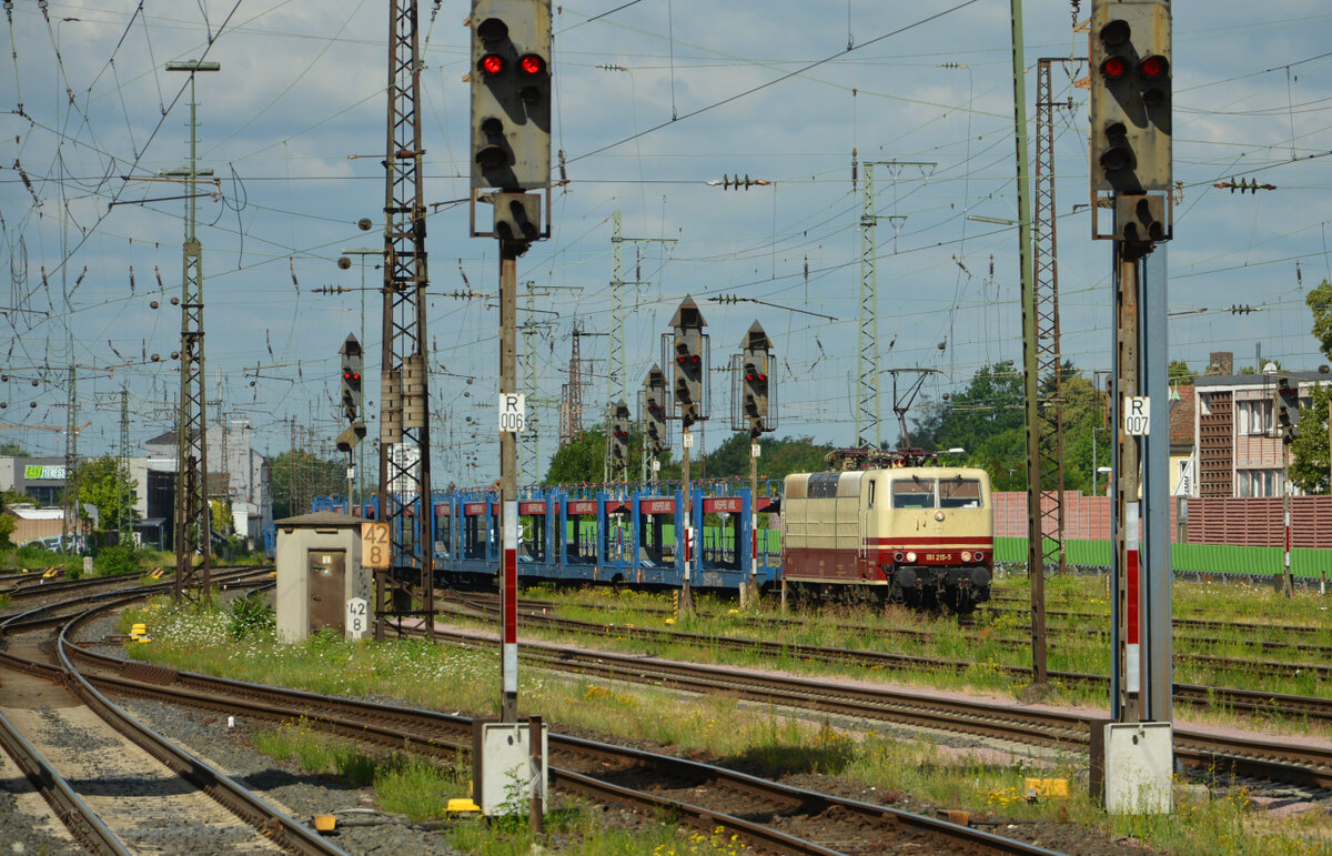 Die SEL 181 215-5 (Schlünß Eisenbahnlogistik) kämpft sich mit einem leeren Milsped-Autotransportzug durch den dichten Masten- und Signalwald in Aschaffenburg. 26.07.2022