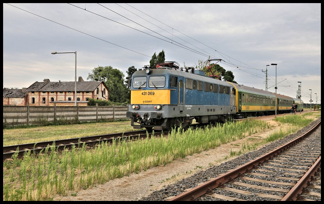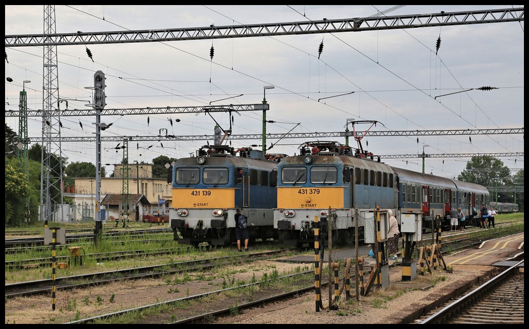 Elektrolok 431139 passiert hier am 15.7.2022 um 9.39 Uhr im Bahnhof Celldömölk einen mit der 431379 bespannten bereit stehenden Personenzug.