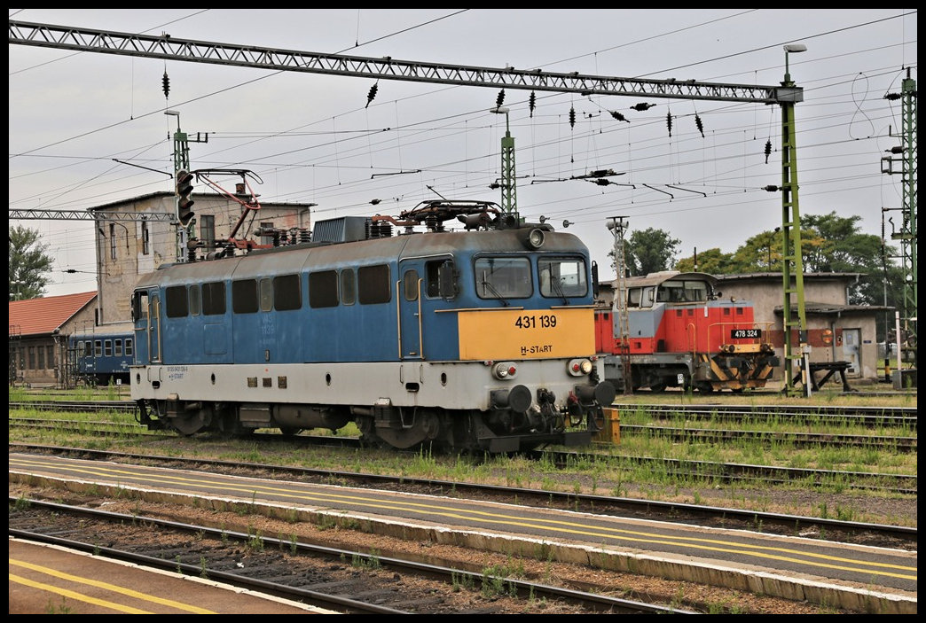 Elektrolok 431139 rangiert hier am 15.7.2022 um 9.39 Uhr im Bahnhof Celldömölk.