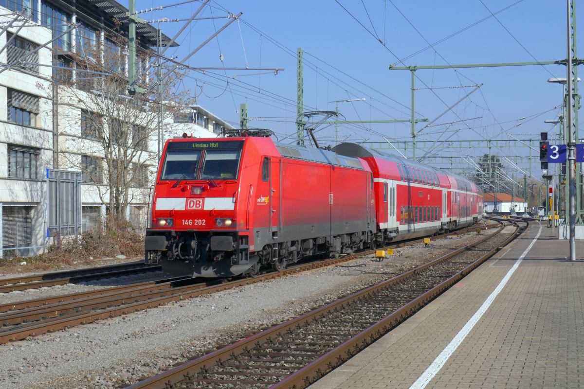 Gerade eben fährt die 146 202 der DB Regio mit einem RE5 Stuttgart - Lindau in Friedrichshafen Hbf ein. 3. März 2022