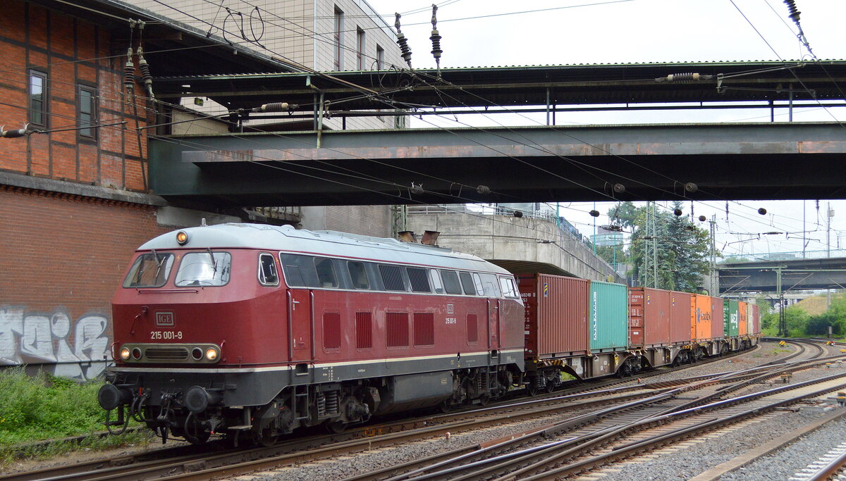 Internationale Gesellschaft für Eisenbahnverkehr IGE GmbH & Co. KG, Hersbruck mit der "215 001-9" (NVR: "92 80 1225 001-7 D-IGE") und Containerzug beim Verlassen des Hamburger Hafen am 22.07.22 Durchfahrt Bhf. Hamburg-Harburg