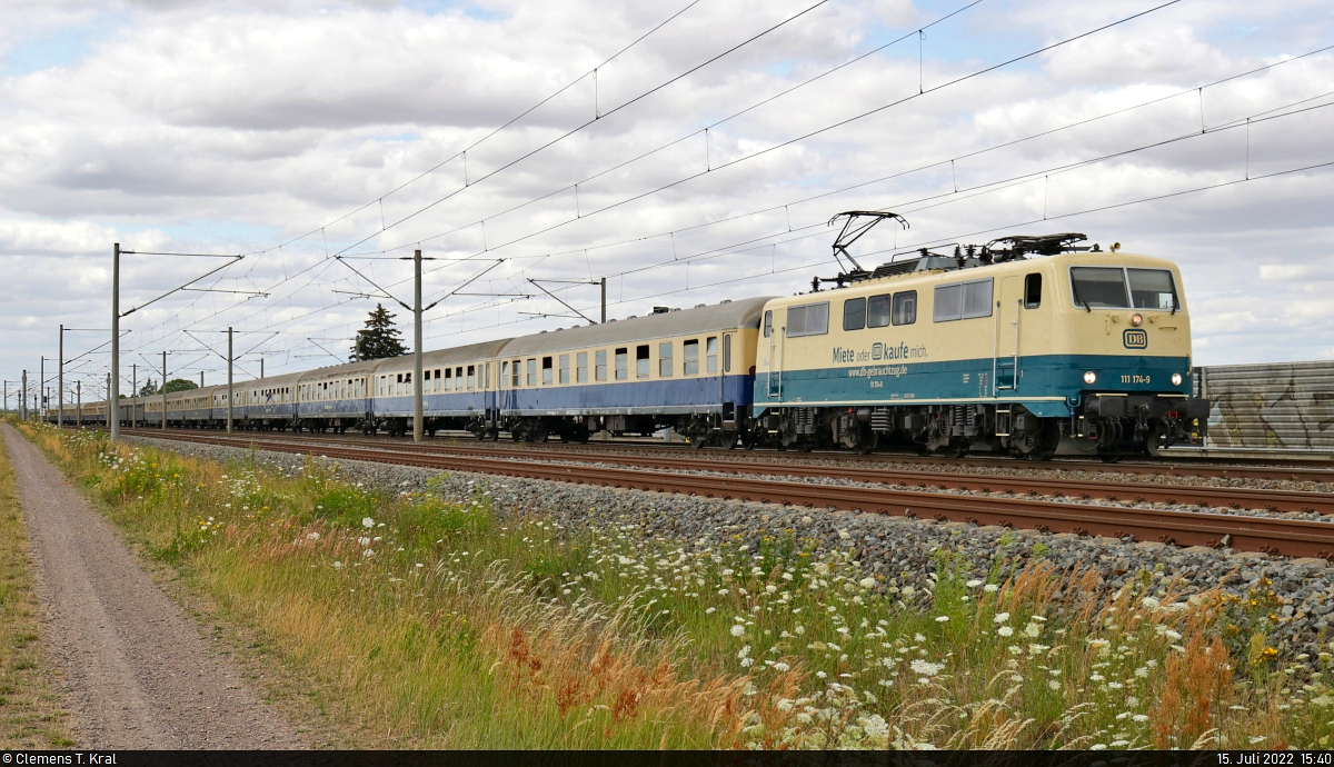Nach und nach trauen sich alle Miet-111er nach Mitteldeutschland. So bespannte kürzlich 111 174-9 "Elfriede" einen aus 15 Wagen bestehenden Sonderzug und wurde in Benndorf (Kabelsketal) erwartet.