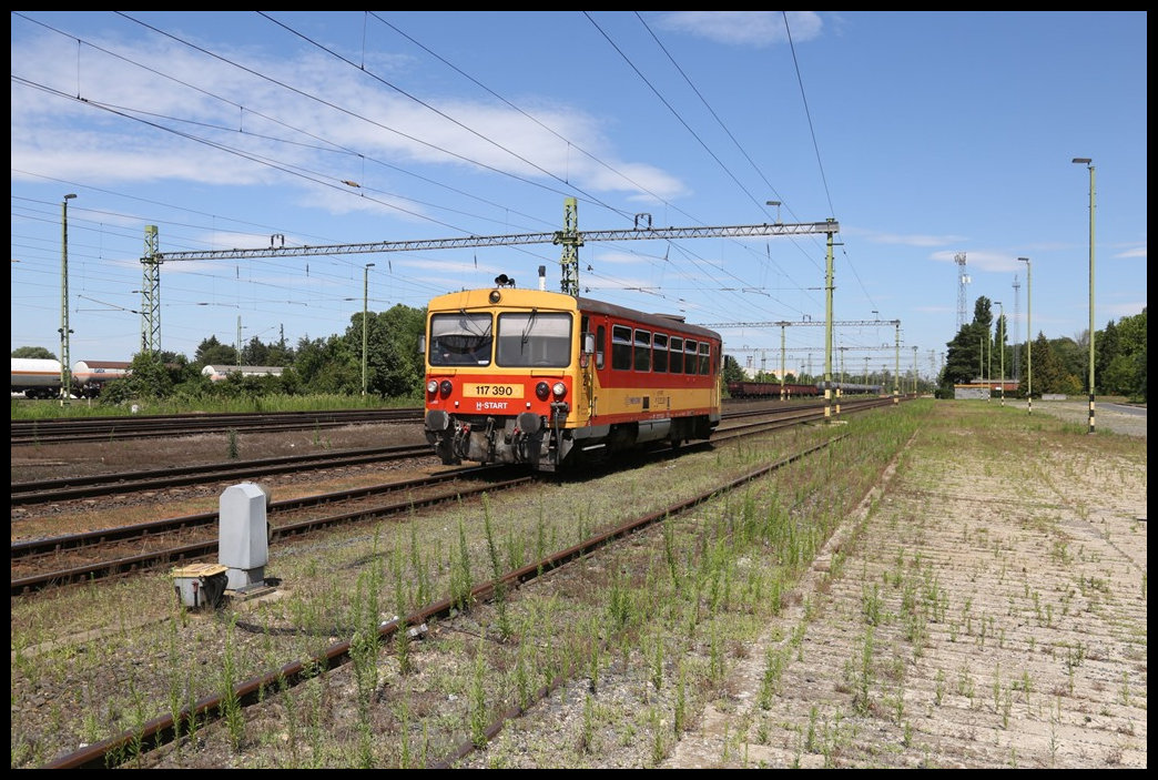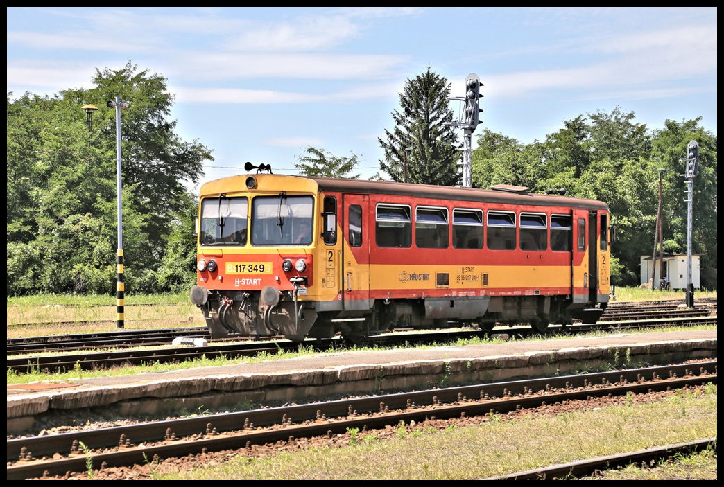 Triebwagen 117349 rangiert hier am 14.7.2022 um 13.37 Uhr im Bahnhof Tapolca.