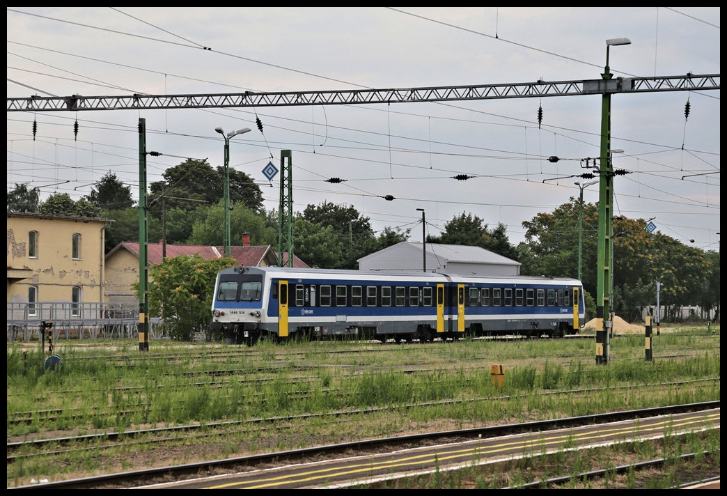 Triebwagen 1446514 fährt hier am 15.7.2022 um 9.44 Uhr zur Tankstelle im Bahnhof Celldömölk.