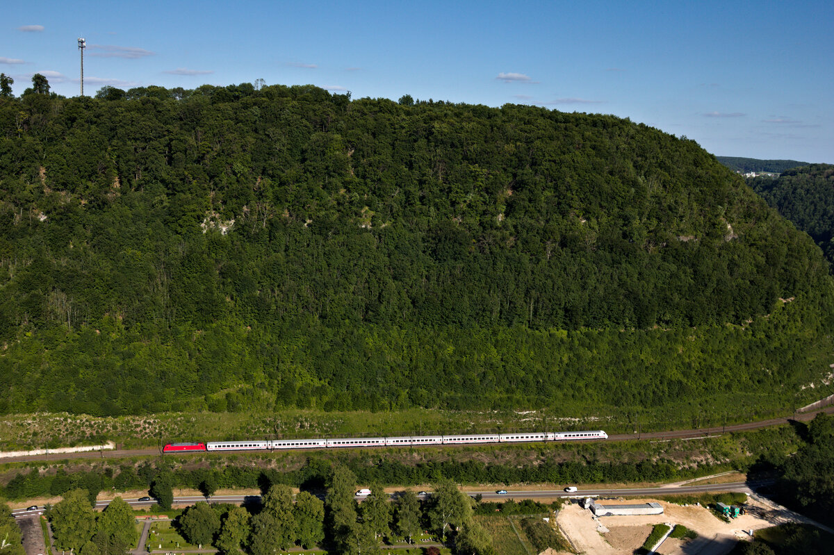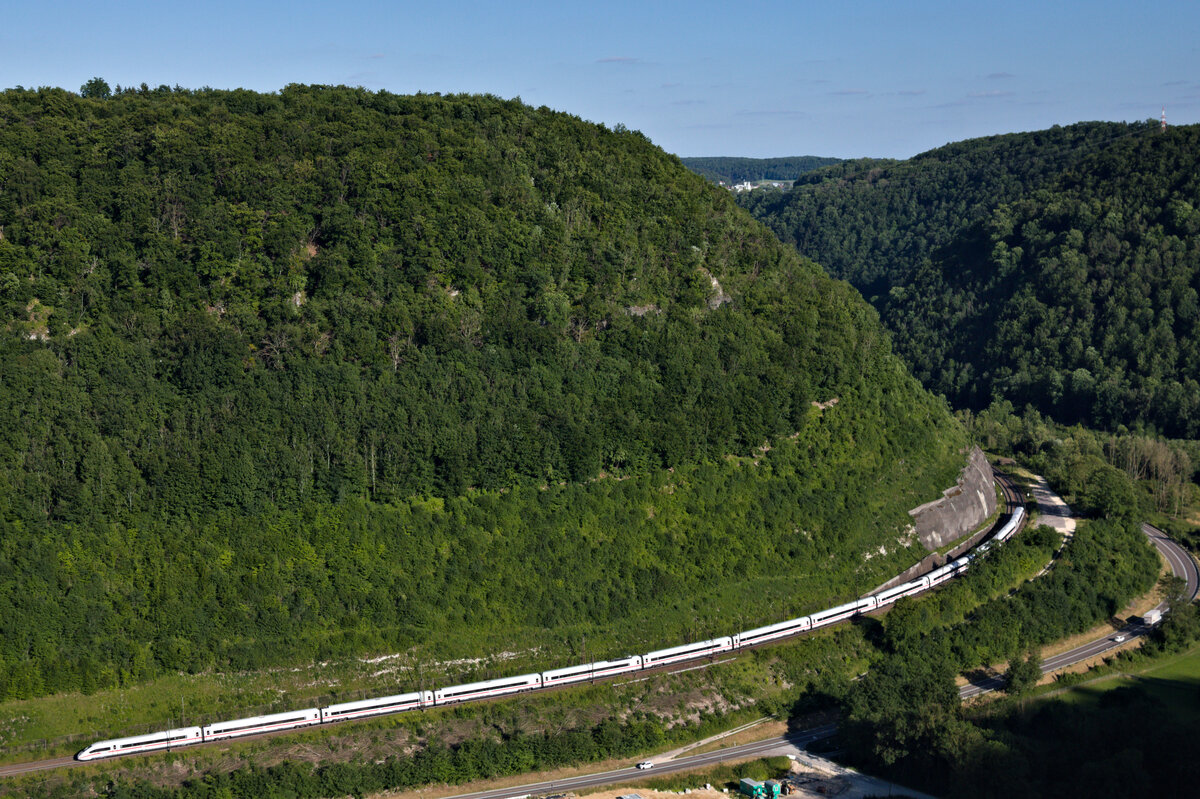 13-teiliger Albinolindwurm schlängelt sich am 08.07.2022 die Geislinger Steige hinauf. Konret handelt es sich um einen unbekannt gebliebenen ICE4 in Richtung München.