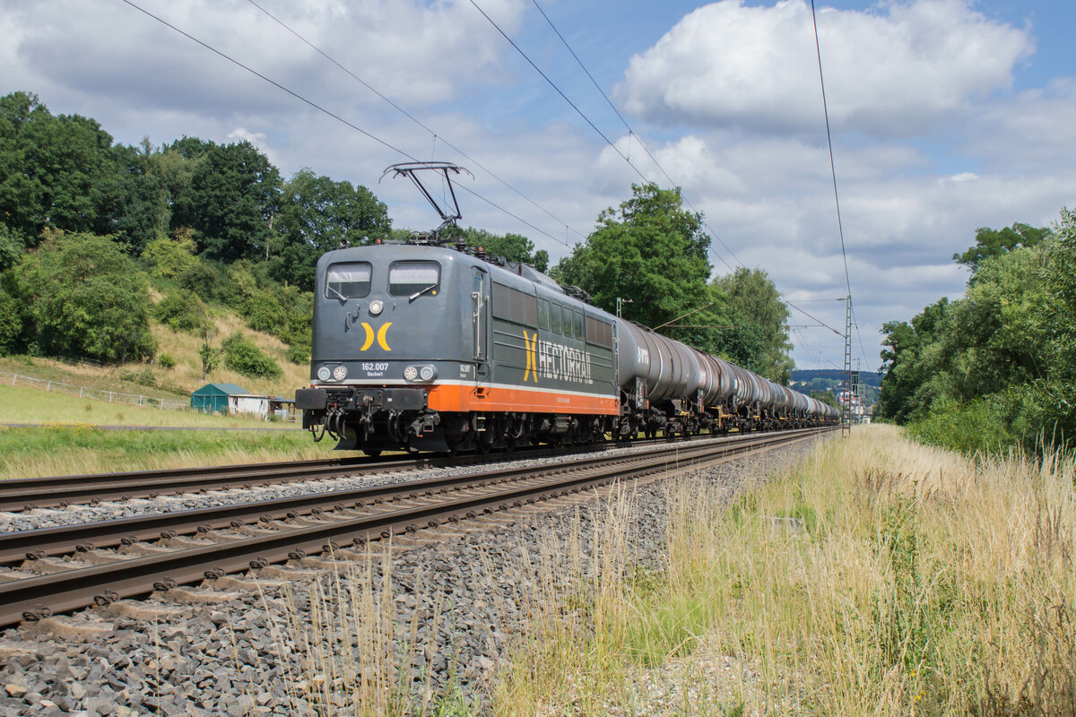 162.007 (151 134-4) ist am 06.07.2022 mit einem Kesselzug bei Unterhaun in Richtung Fulda unterwegs.