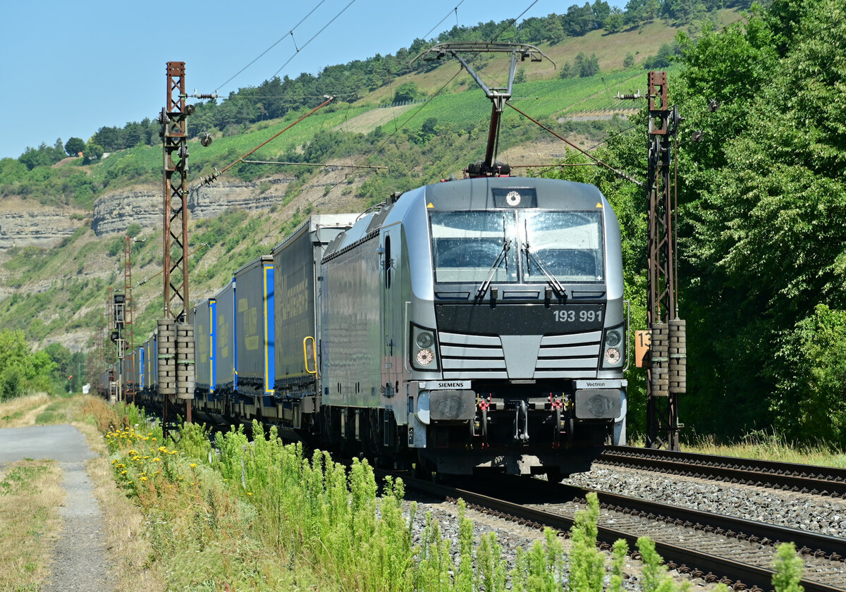 193 991 mit einem Auto Walter KLV durch Thüngersheim fahrend gen Würzburg.19.7.2022