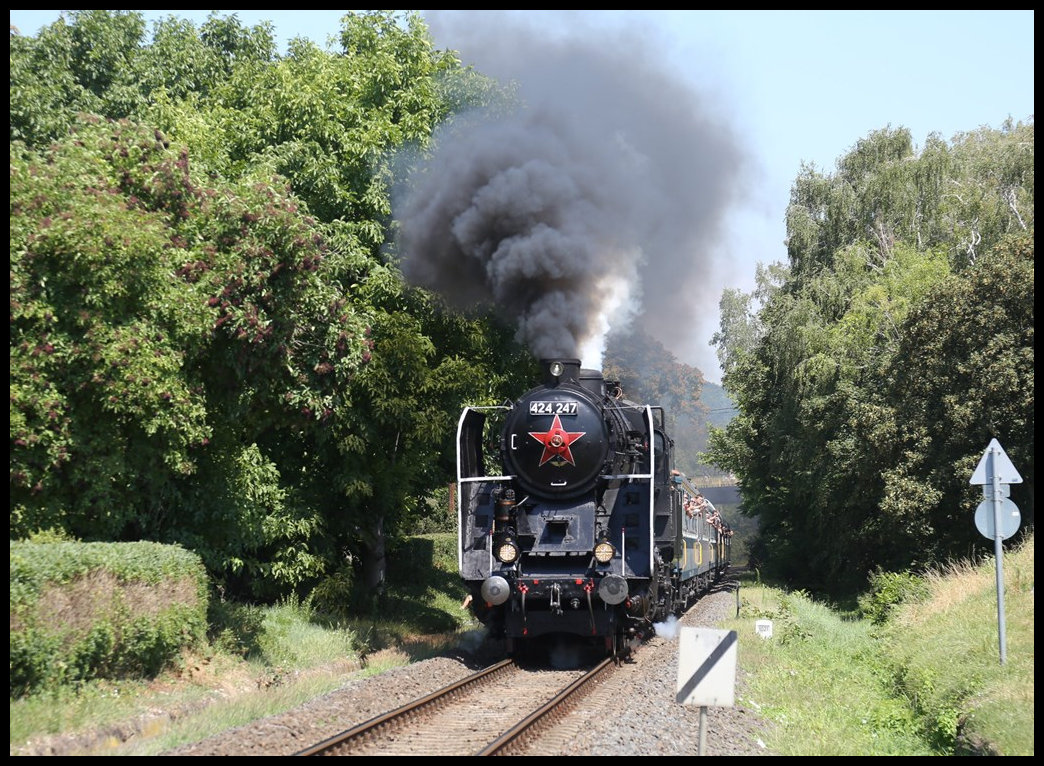 Als einzige Dampflok war die schwere 424247 der MAV in das Nostalgieprogramm am 16.7.2022 eingebunden. Mit großer Verspätung ist sie hier kurz nach Verlassen des Bahnhof Badacsonytomaj mit ihrem Zug nach Tapolca um 11.50 Uhr unterwegs.