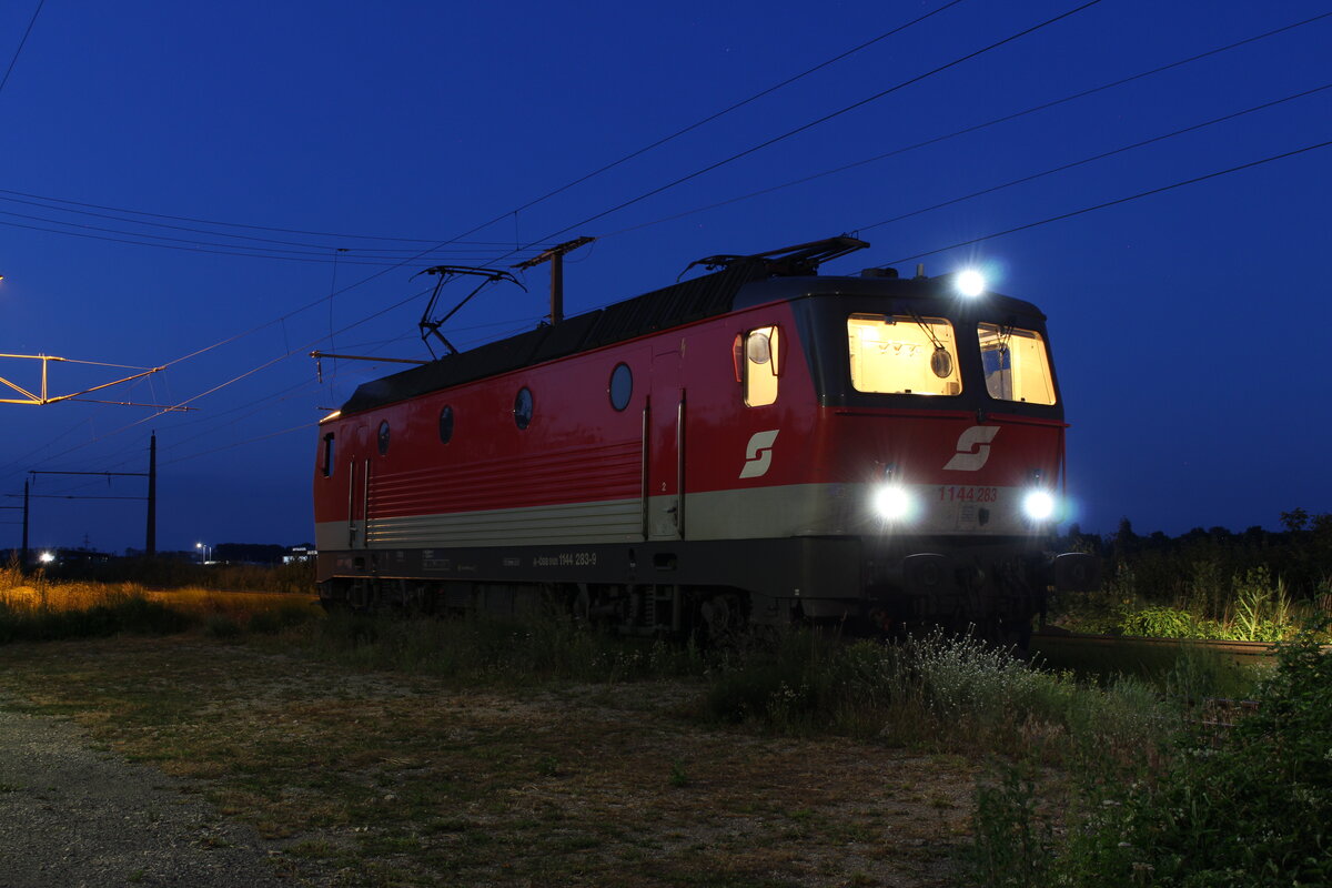 Als SLZ18489 von Wien Zvb nach Wiener Neustadt und weiter als GLZ87576 nach Felixdorf fährt am Abend des 28.7.2022 die 1144 283 die wieder ihr (fast) ursprüngliches Design mit Platsch besitzt.