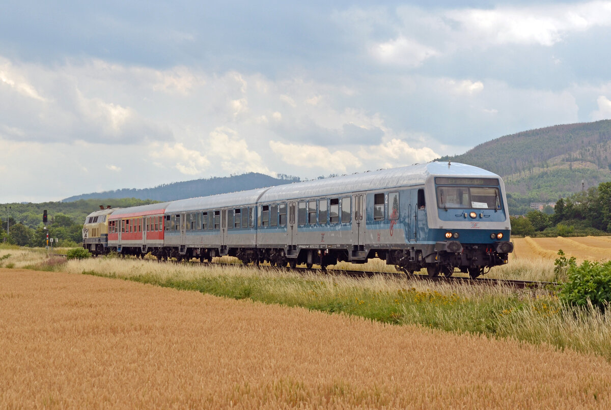Am 05.07.22 hatte einer der beiden Ersatzzüge Ilsenburg bereits hinter sich gelassen und war nun auf dem Weg nach Goslar. Geschoben hatte 218 472 von Powerrail.